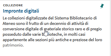 - Collezioni in vetrina (obiettivo di questa collezione è di mettere in evidenza e far conoscere agli utenti collezioni e/o fondi particolari delle nostre biblioteche)