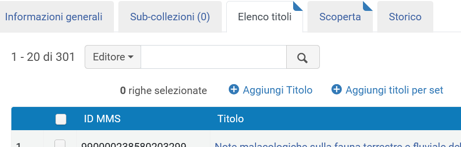 Se il parametro è flaggato, nella tab Elenco titoli abbiamo la possibilità di selezionare un set logico di titoli (fisici, ma anche elettronici) e assegnarlo alla collezione “logica”.
