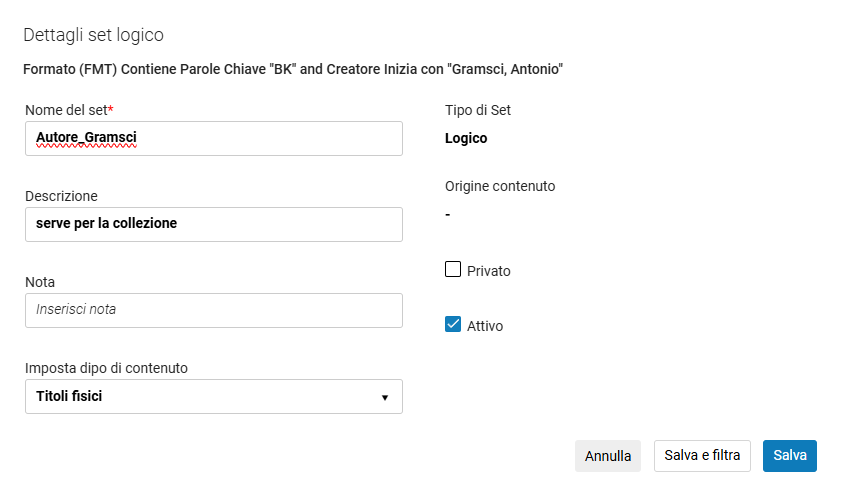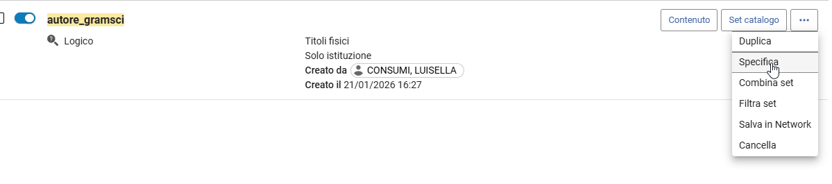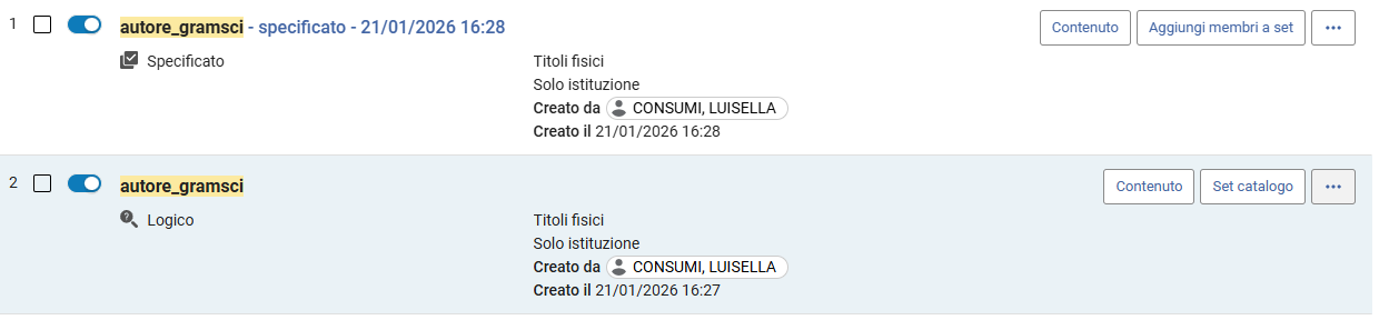 NB: In questo momento i due set hanno lo stesso contenuto (numero di titoli). Sul set specificato è possibile aggiungere altri titoli. Il set specificato è "fisso", mentre quello logico è suscettibile di incrementi/decrementi sulla base della query iniziale.