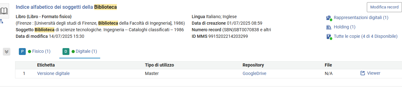 Pur non avendo sottoscritto l'abbonamento ad Alma Digital è possibile aggiungere una rappresentazione digitale a un record presente in catalogo. Il record può avere già holding fisiche o portfolio elettronico, oppure essere creato ad hoc.