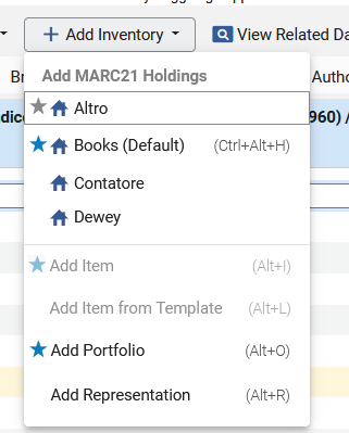 Portare il record bibliografico in MdEditor. Cliccare su Add Inventory e successivamente >aggiungi rappresentazione